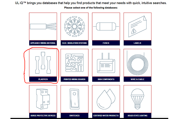 二、找到对应我们要查询的项目,如塑料原料的UL,就点击PLASTICS,